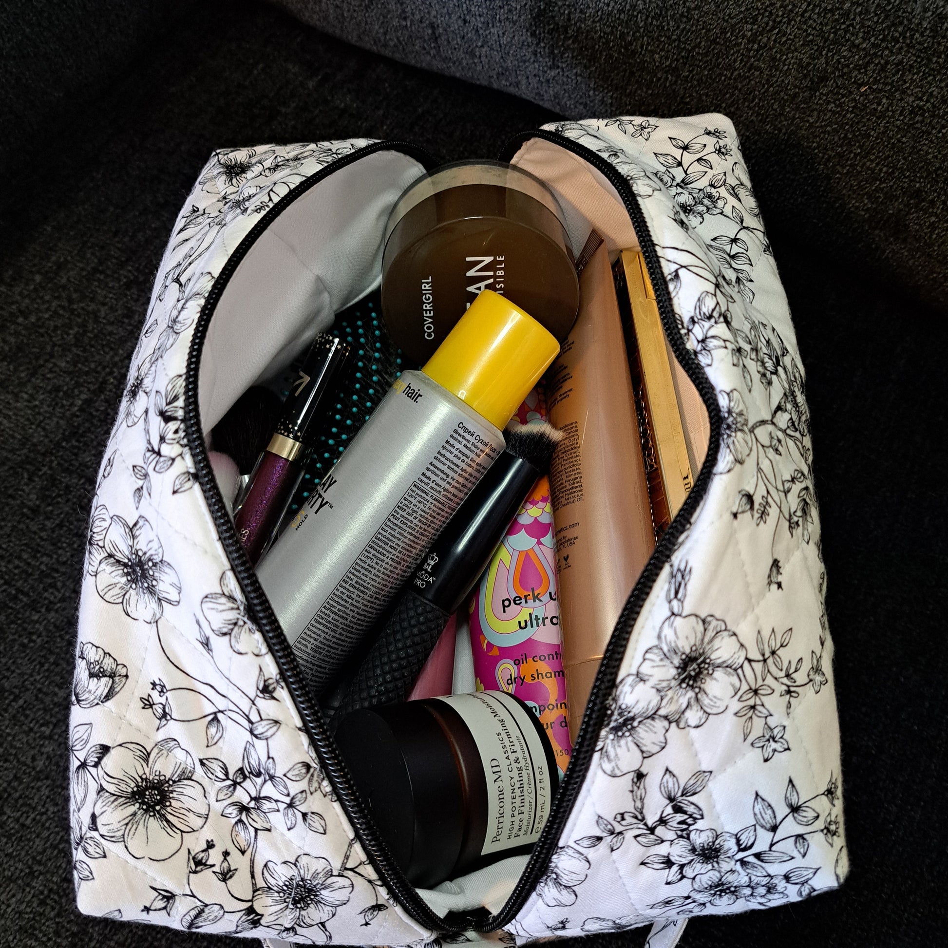 The XL Angel Cosmetic Bag is your perfect everyday or travel companion. Handmade with care, this bag combines style and function with a unique quilted exterior showcasing striking black floral outlines on a clean white background, complemented by a white interior and a contrasting black zipper and a convenient handle for easy carrying.