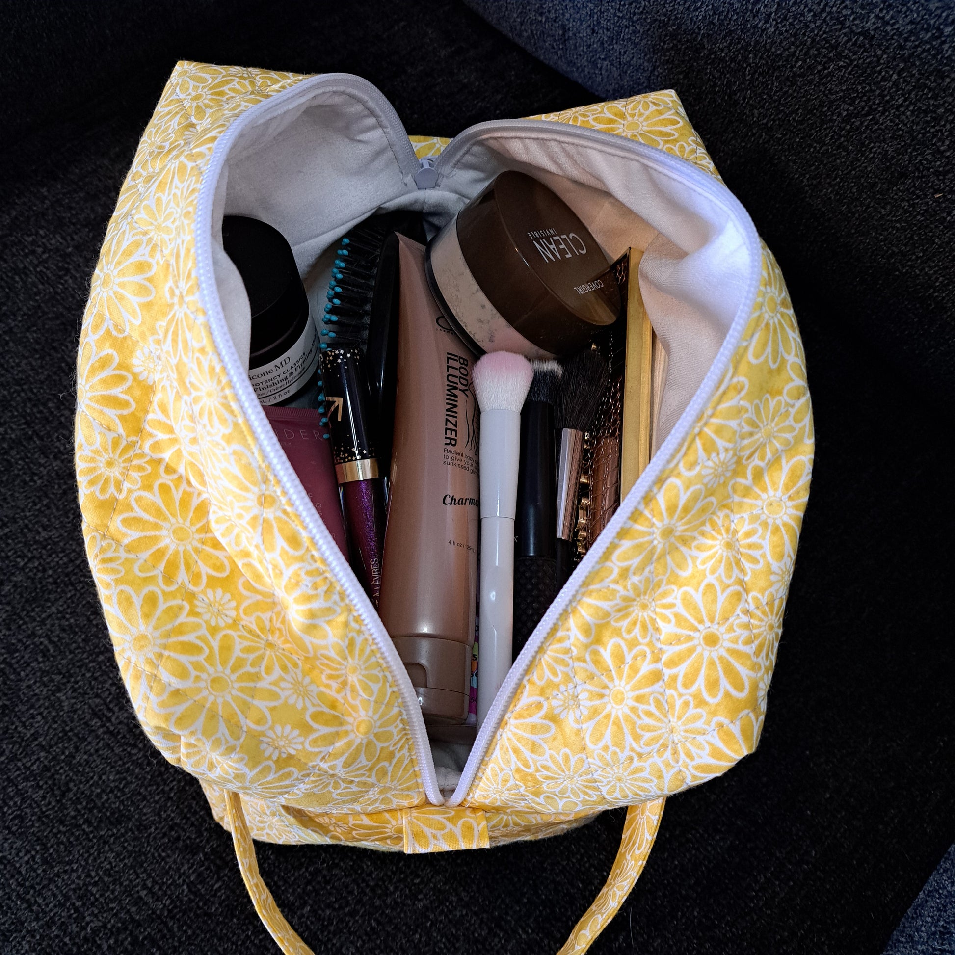 The XL Angel Cosmetic Bag is your perfect everyday or travel companion. Handmade with care, this bag combines style and function with a unique quilted exterior featuring delicate flower outlines on a cheerful yellow background with a white-on-white interior and white zipper and a convenient handle for easy carrying.