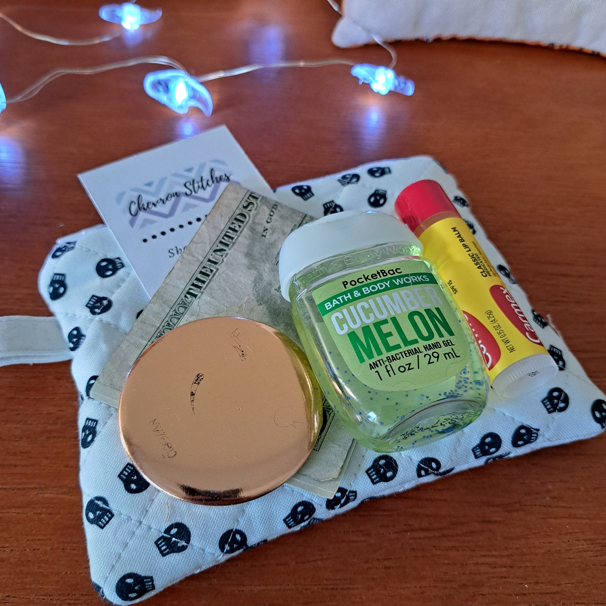 This version showcases mini black skulls on a white background. Also, featuring a quilted exterior and fully lined interior, it’s built for everyday durability. The attached clasp allows you to easily secure it to your keys, bag, or belt loop—ideal for hands-free convenience when traveling light.
