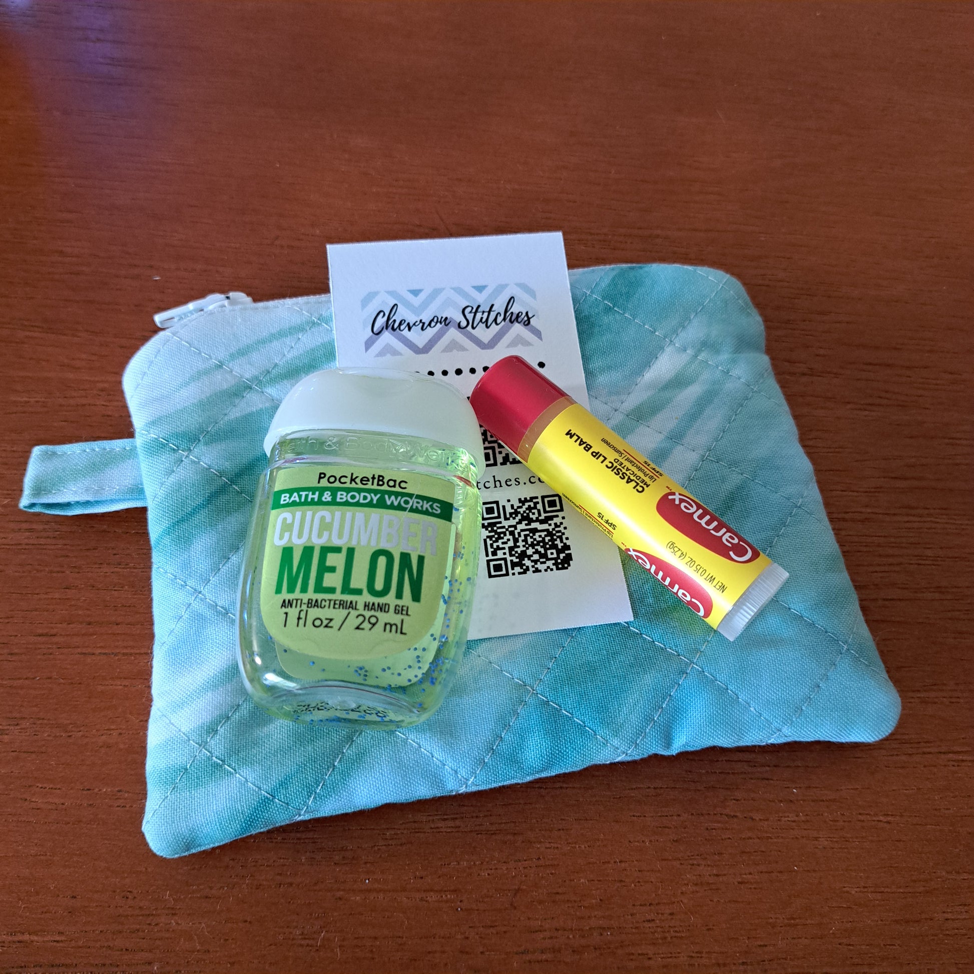 This version showcases soft blue, green, and white tones, complemented by a white-on-white lined interior and a sturdy light blue zipper. Featuring a quilted exterior and fully lined interior, it’s built for everyday durability. The attached clasp allows you to easily secure it to your keys, bag, or belt loop—ideal for hands-free convenience when traveling light.