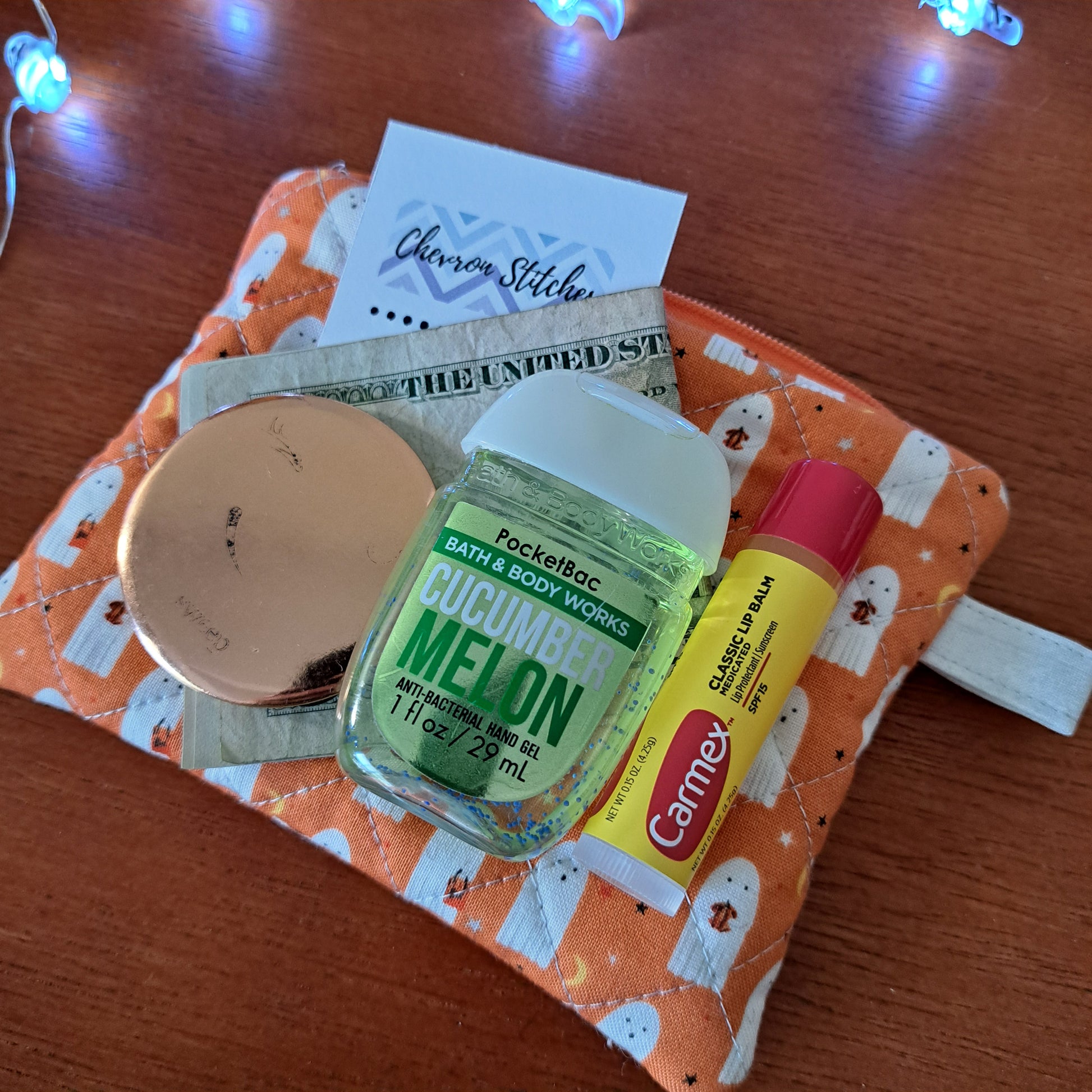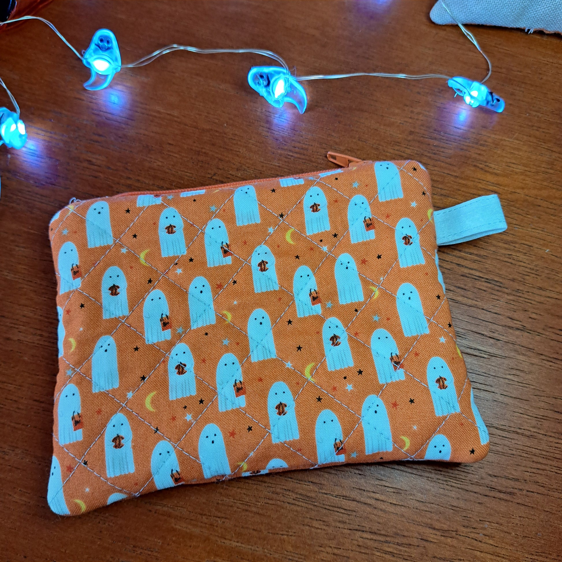 This version showcases cute little ghosts on an orange background. Also, featuring a quilted exterior and fully lined interior, it’s built for everyday durability. The attached clasp allows you to easily secure it to your keys, bag, or belt loop—ideal for hands-free convenience when traveling light.